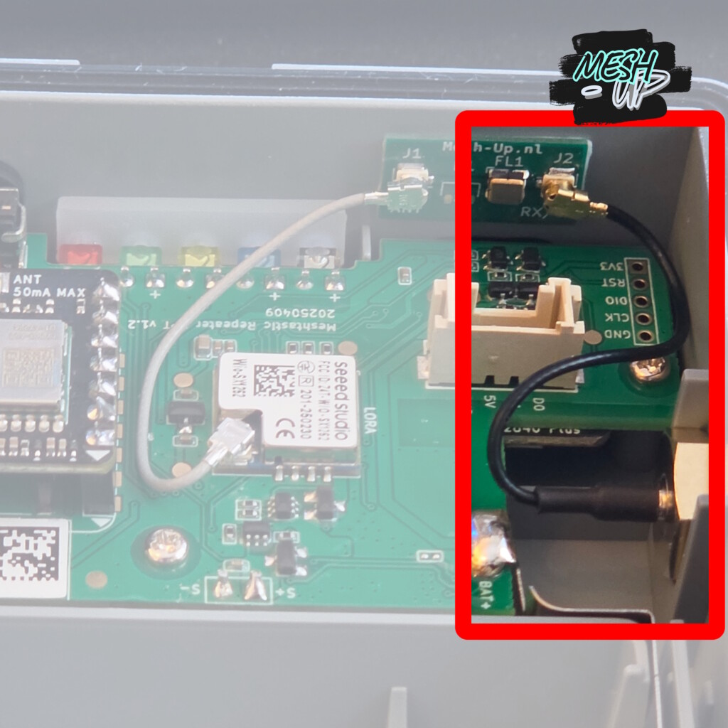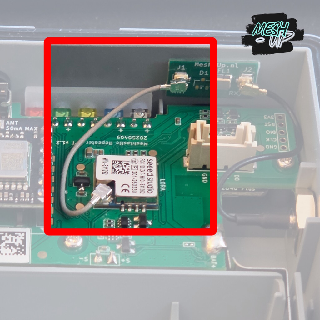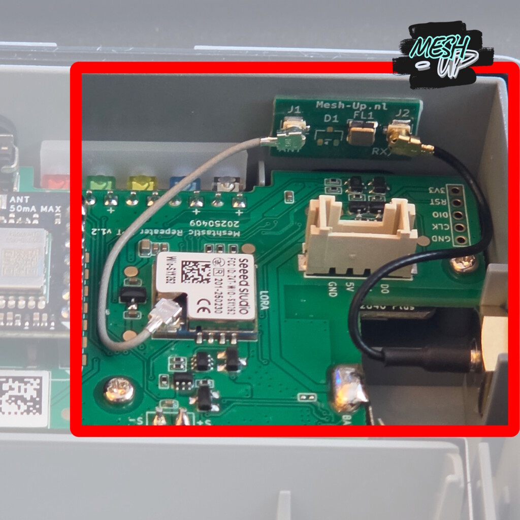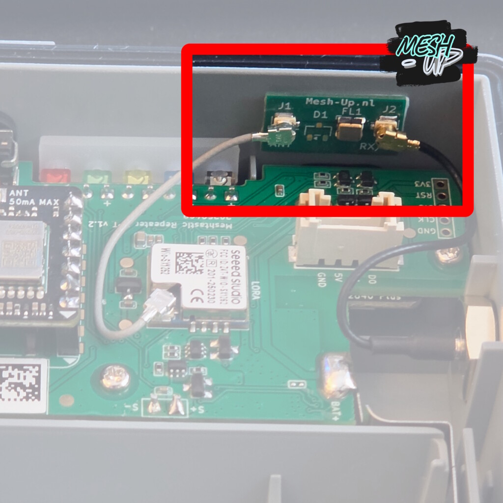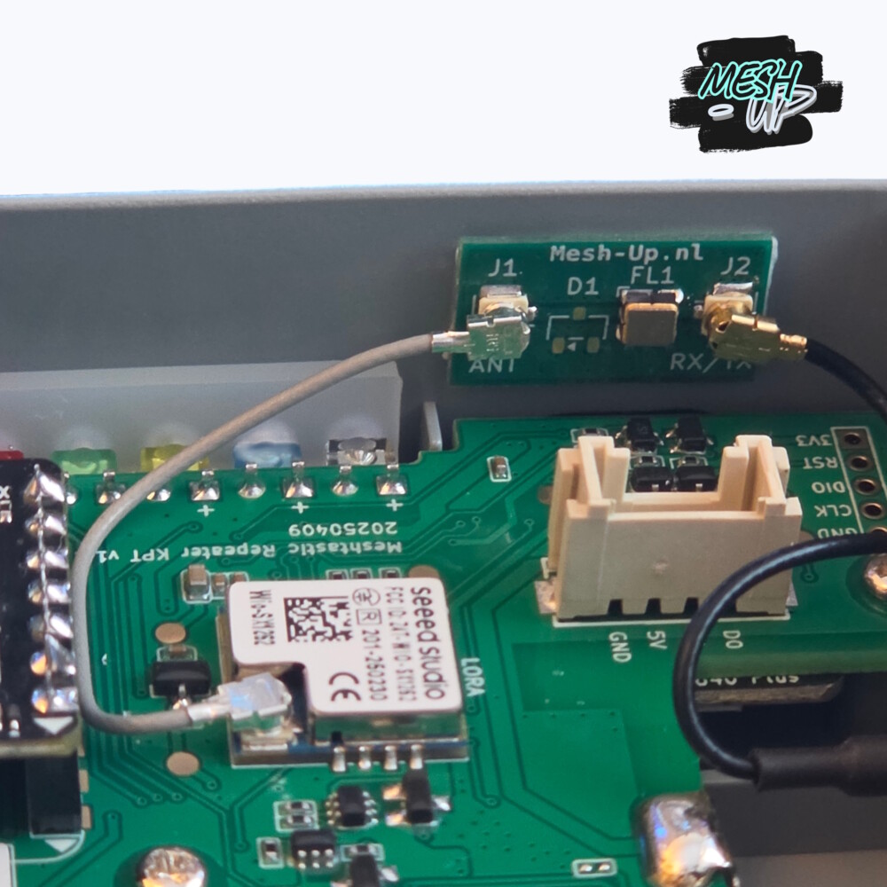 Deze SAW filter kan maximaal 20dBm aan zendvermogen verwerken! Zorg er dus voor dat jouw Repeater wordt gelimiteerd op maximaal 20dBm via de ‘Repeater Admin’ in de MeshCore App. Je kunt ook onze Repeater Configurator gebruiken om het zendvermogen te limiteren. Hiervoor kies je in stap 3 voor ‘Limiteren op 100mW (20 dBm)’.