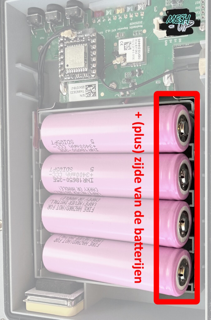 Zorg er eerst voor dat de antenne verbonden is op de connector aan de buitenzijde van de Repeater! Plaats daarna de batterijen in de oriëntatie zoals weergegeven op de afbeelding hieronder (de zijde met het uitstekende dopje is de Plus)