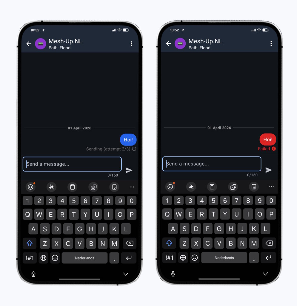 Bij een privébericht naar één specifiek contact in jouw contactenlijst, is de gewenste eindbestemming natuurlijk duidelijk; namelijk de contactpersoon aan wie je jouw bericht verstuurt. De MeshCore App kan daarom weergeven of een bericht correct ontvangen is. Wanneer de app aangeeft dat een berichtje niet aangekomen is bij de ontvanger, dan weet je in elk geval zeker dat de verbinding tussen jullie twee niet goed genoeg was. Dit kan aan erg veel factoren liggen, maar de meest voorkomende factoren staan hieronder opgesomd: