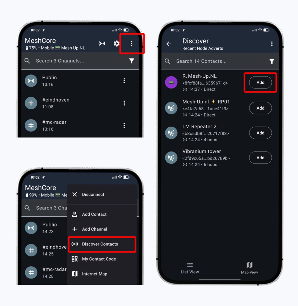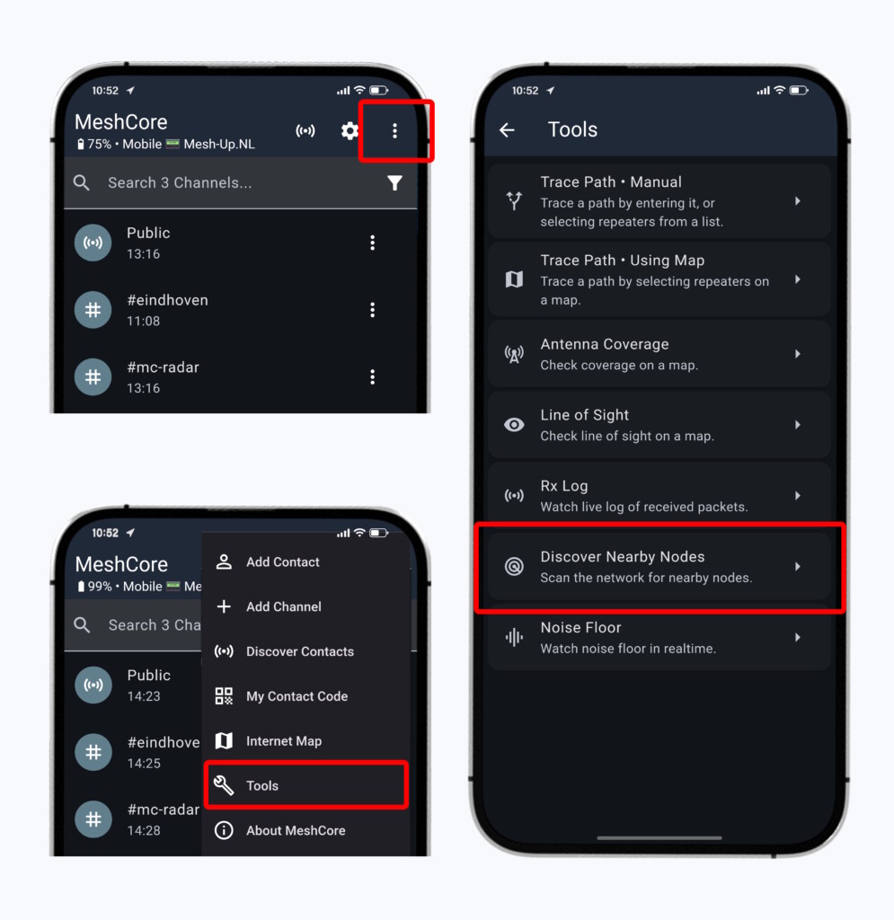 Wanneer je twee MeshCore Companions naast elkaar op tafel zet en de ene verstuurt een berichtje, zal de andere dit bericht natuurlijk ontvangen. Dit komt omdat deze twee apparaten een directe zichtverbinding met elkaar hebben en er géén obstakels in de weg staan die de radiogolven blokkeren. Maar als we langere afstanden willen overbruggen, dan kan er onderweg van alles gebeuren met ons berichtje, waardoor het niet zijn ‘eindbestemming’ behaalt. Daarom is het belangrijk dat we eerst bepalen of we op z’n minst in de buurt zijn van één Repeater, en wat de ‘eindbestemming’ van ons berichtje dan zou moeten zijn.