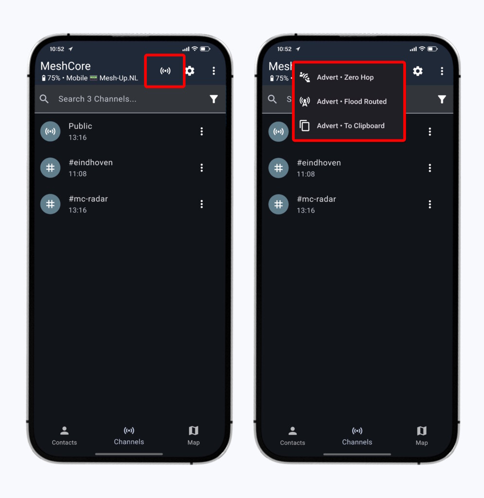 Hiermee stuurt jouw Companion géén Advert uit, maar in plaats daarvan wordt de ‘code’ van jouw Advert in het klembord van jouw Smartphone geplaatst. Hierdoor kun je deze zelf gemakkelijk delen door deze Advert te ‘plakken’ in bijvoorbeeld WhatsApp, om zo jouw MeshCore contactgegevens handmatig door te sturen naar specifieke personen.