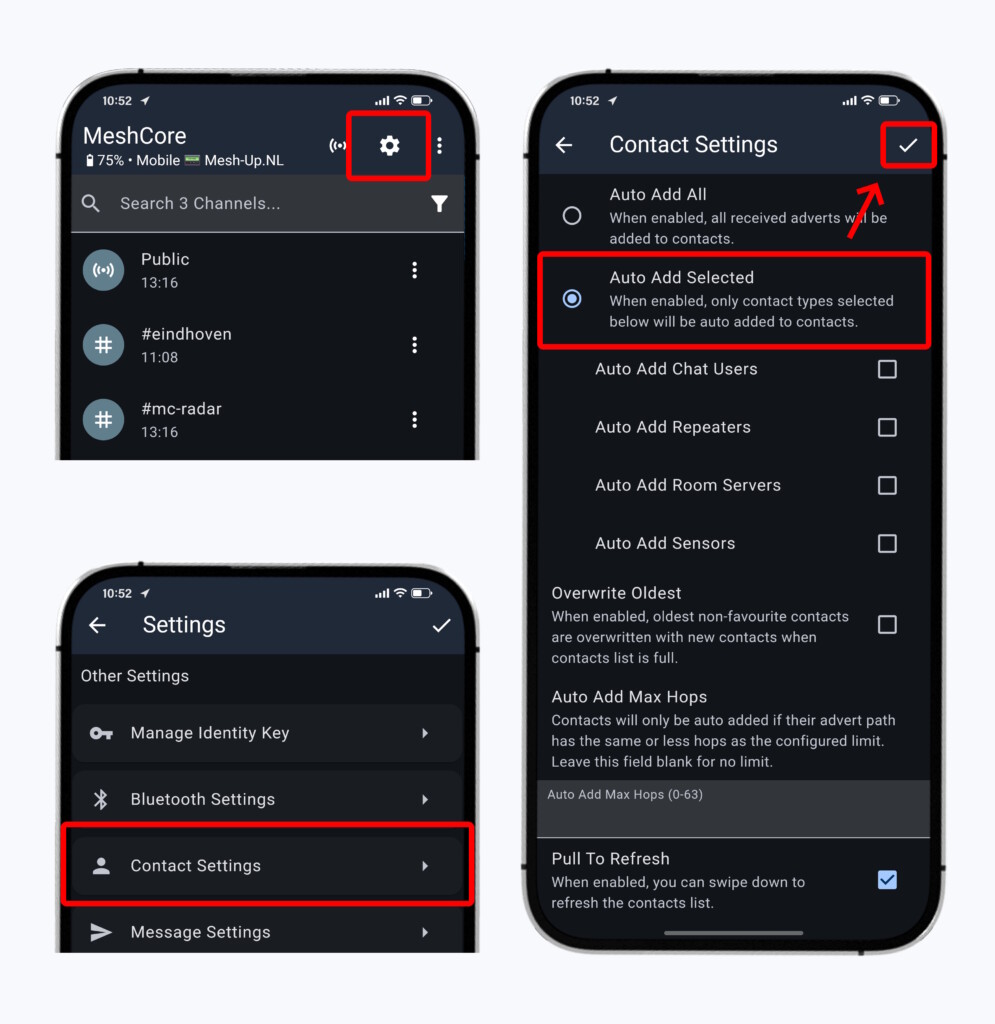 Dit is niet erg praktisch wanneer je in een gebied woont met goede MeshCore dekking omdat je dan uiteindelijk héél Nederland in jouw contactenlijst hebt staan. Daarom raden we aan om het automatisch toevoegen van contacten UIT te zetten. Je kunt dit uitschakelen op deze manier: