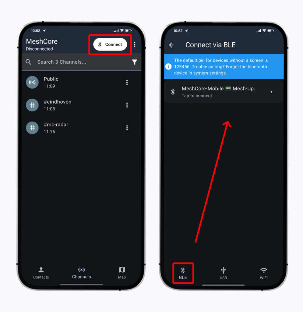 Een MeshCore Companion wordt meestal aan jouw Smartphone gekoppeld via BlueTooth. Je kunt de Companion koppelen door de onderstaande stappen te volgen:
