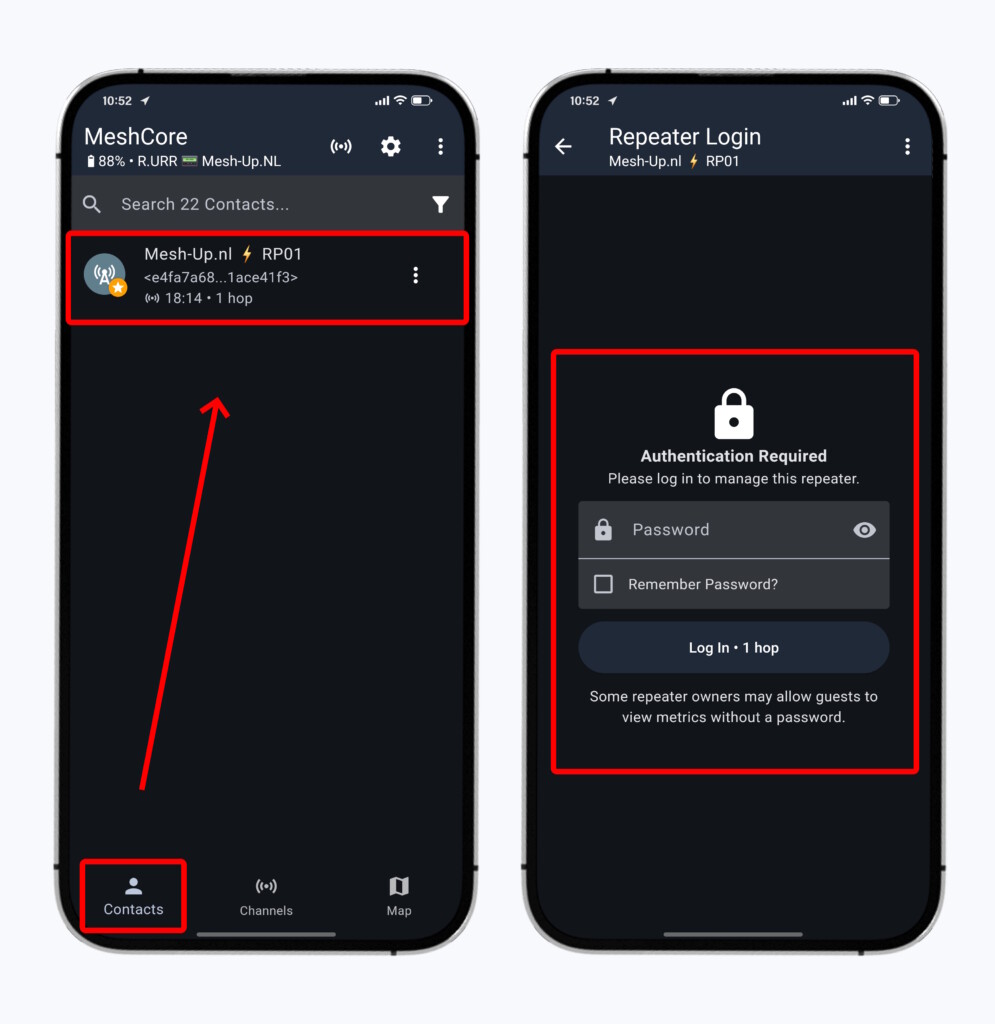 Om in te kunnen loggen bij de Remote Admin Tool van jouw Repeater moet de Repeater in jouw contactenlijst staan. Je kunt de handleiding ‘Wat is het doel van de Adverts’  lezen als je niet weet hoe je contacten kunt toevoegen aan jouw contactenlijst. Repeaters die je op onze webshop hebt gekocht sturen automatisch een Zero-Hop Advert na het opstarten, en vervolgens elke 3 uur. Wanneer je de Repeater via deze Advert hebt toegevoegd aan jouw contactenlijst, kun je op deze manier inloggen bij de Remote Admin Tool: