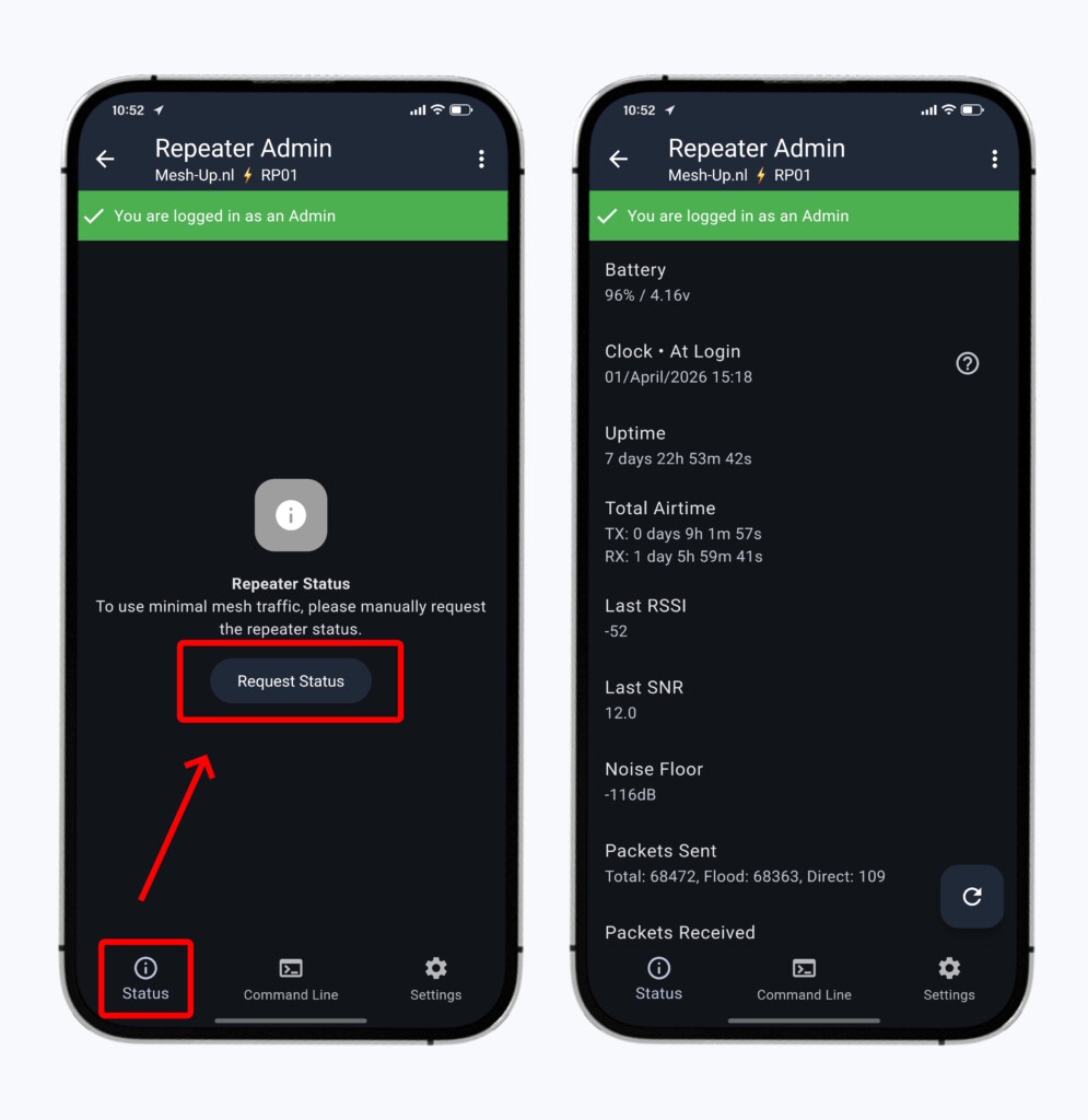Nadat je de status hebt opgevraagd verschijnt een lijst van alle informatie die de Repeater te bieden heeft. Deze data kun je gebruiken om de prestaties van jouw Repeater in de gaten te houden, en om te zoeken naar mogelijke verbeterpunten. Op het optimaliseren van een Repeater gaan we in deze handleiding niet verder in. Je kunt hierover meer lezen op de pagina ‘Repeaters voor PRO’s‘.