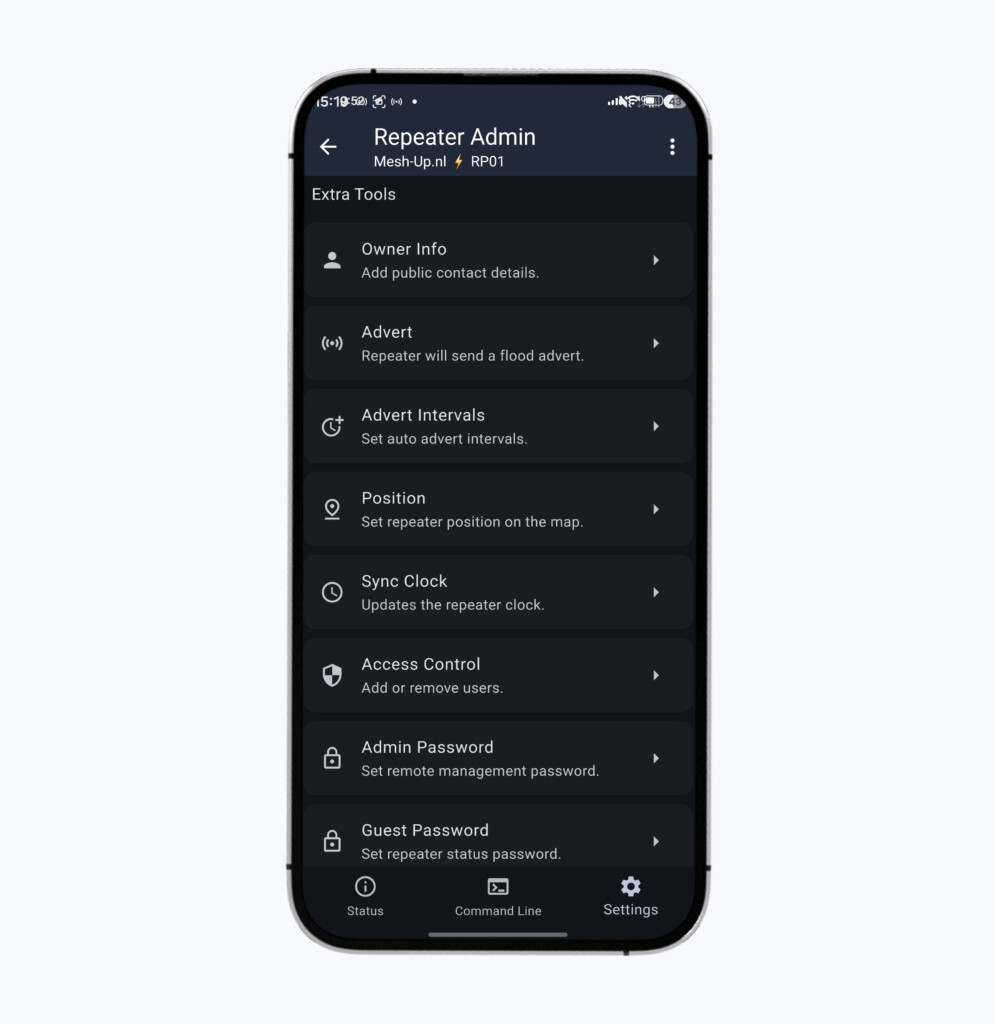 Natuurlijk kun je zelf ook instellingen wijzigen zodat je de Repeater beter kunt afstemmen op jouw wensen. Dit kun je doen door in te loggen op de ‘Remote Admin Tool’ van jouw Repeater via de MeshCore App. Hieronder staat uitgelegd hoe je dit doet.